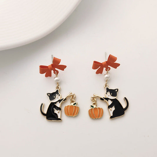 BA5988自主設計小猫咪蝴蝶結南瓜燈籠S925銀針耳釘2023.08.15